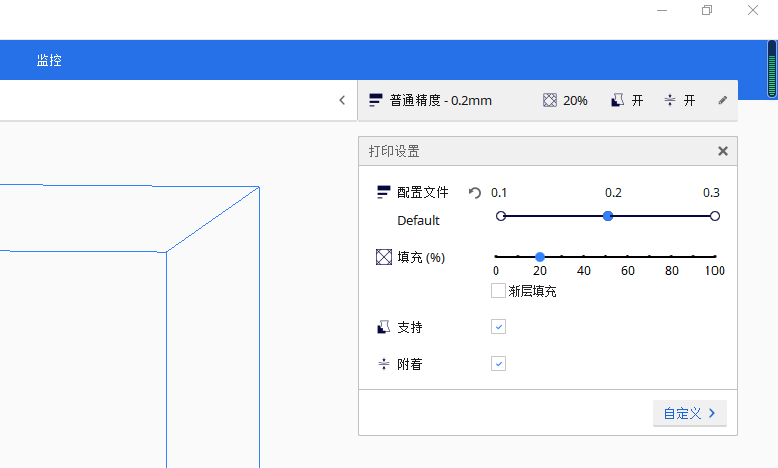 此功能可實(shí)現(xiàn)只在模型頂部需要支撐的區(qū)域產(chǎn)生填充,相比無填充,保證了模型頂部不會(huì)掉落,并較大幅度減少了打印時(shí)間和用料。