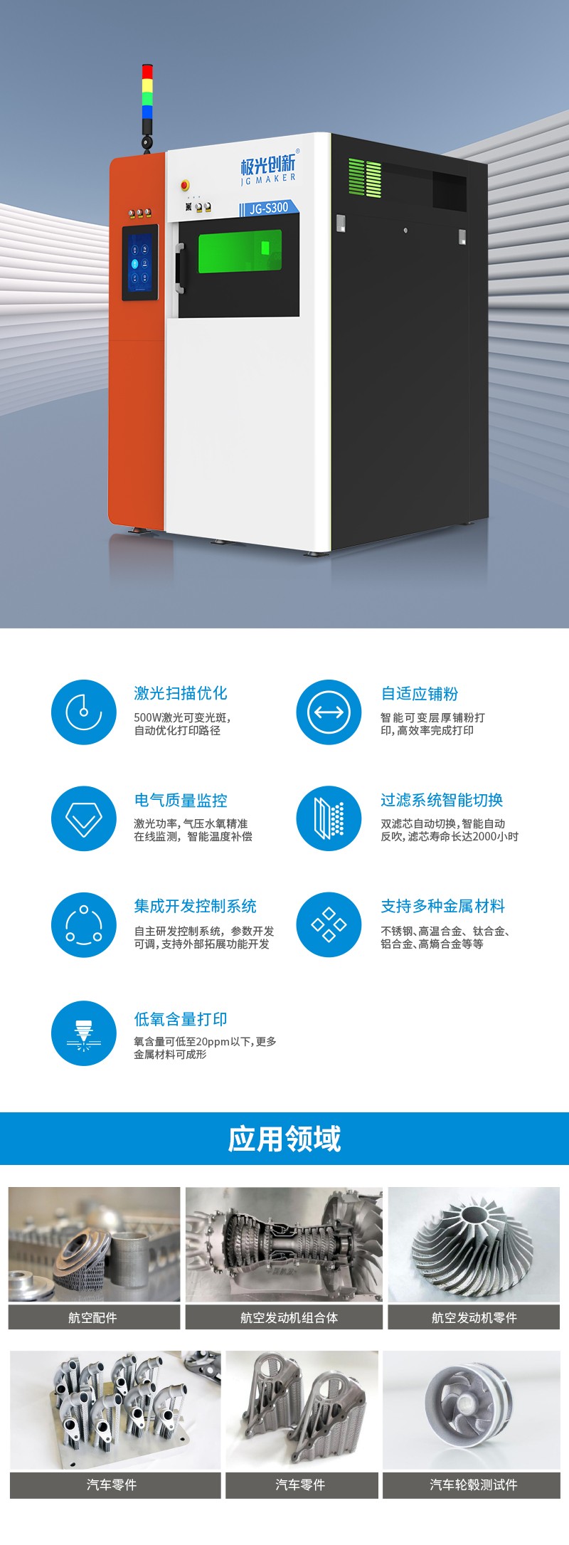 同時(shí),作為3D打印行業(yè)的頭部企業(yè),極光創(chuàng)新一直緊跟市場(chǎng)步伐,積極研發(fā)出更適合市場(chǎng)需求的3D打印產(chǎn)品,日前推出的全新工業(yè)級(jí)金屬3D打印設(shè)備JG-S300,可以全方位滿(mǎn)足工業(yè)市場(chǎng)各領(lǐng)域用戶(hù)的需求,助力企業(yè)加快市場(chǎng)研發(fā)效率、降本增效的同時(shí),不斷提升市場(chǎng)的占有率。