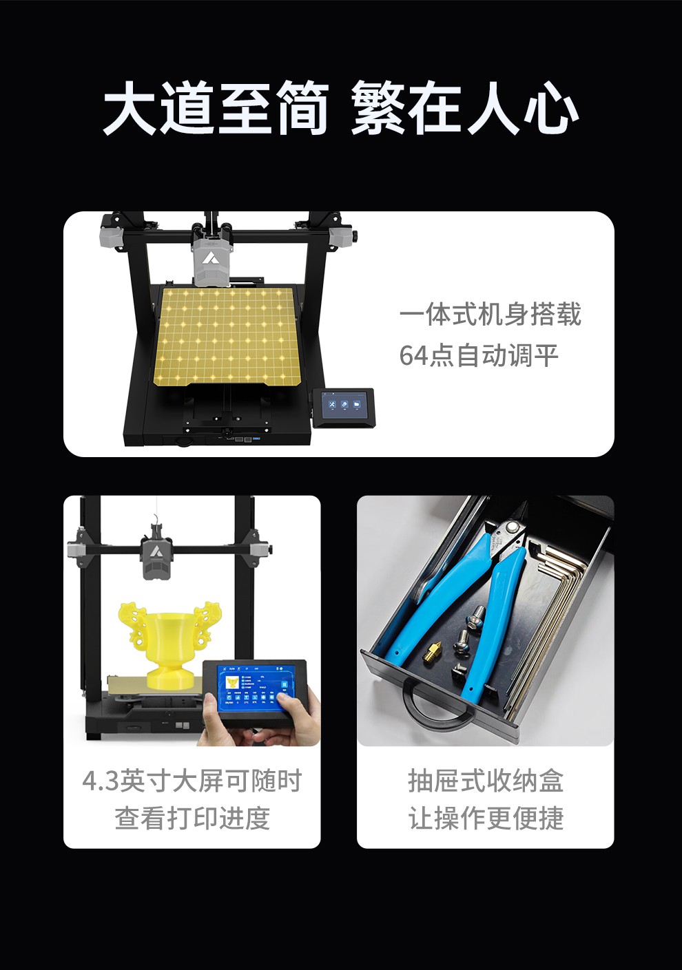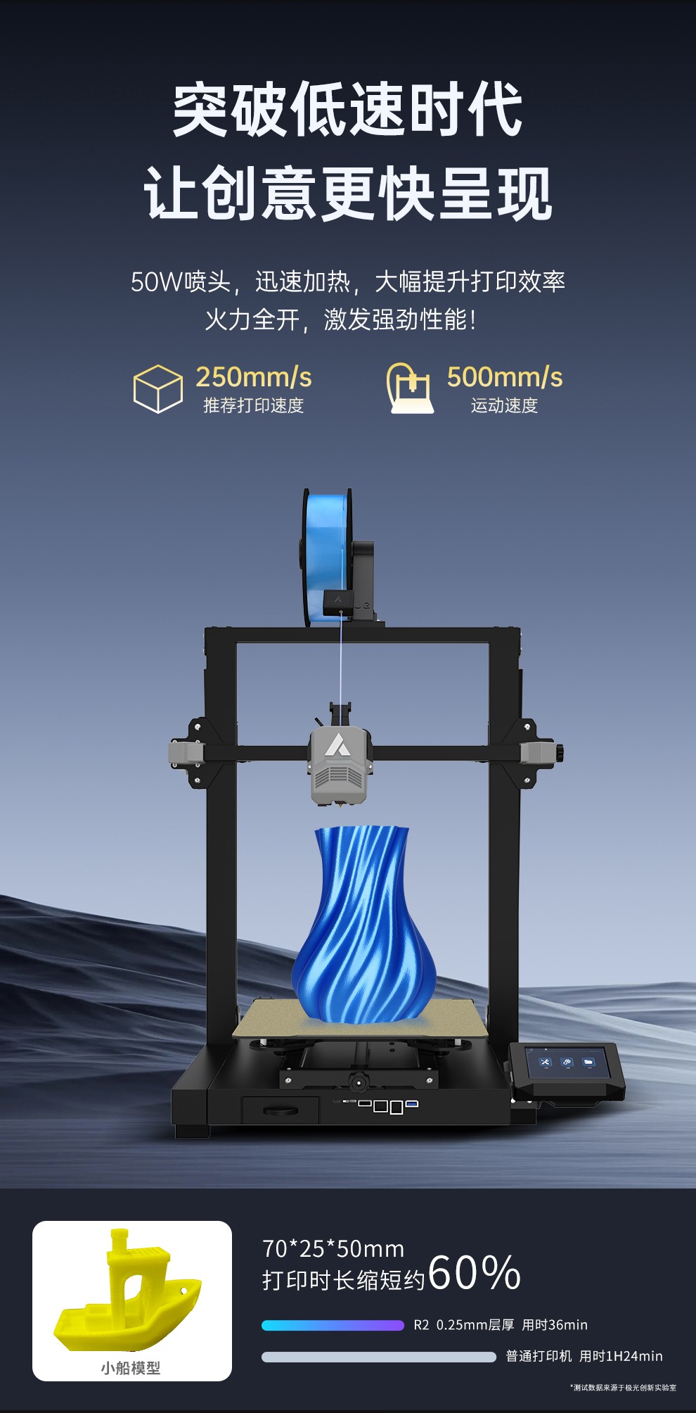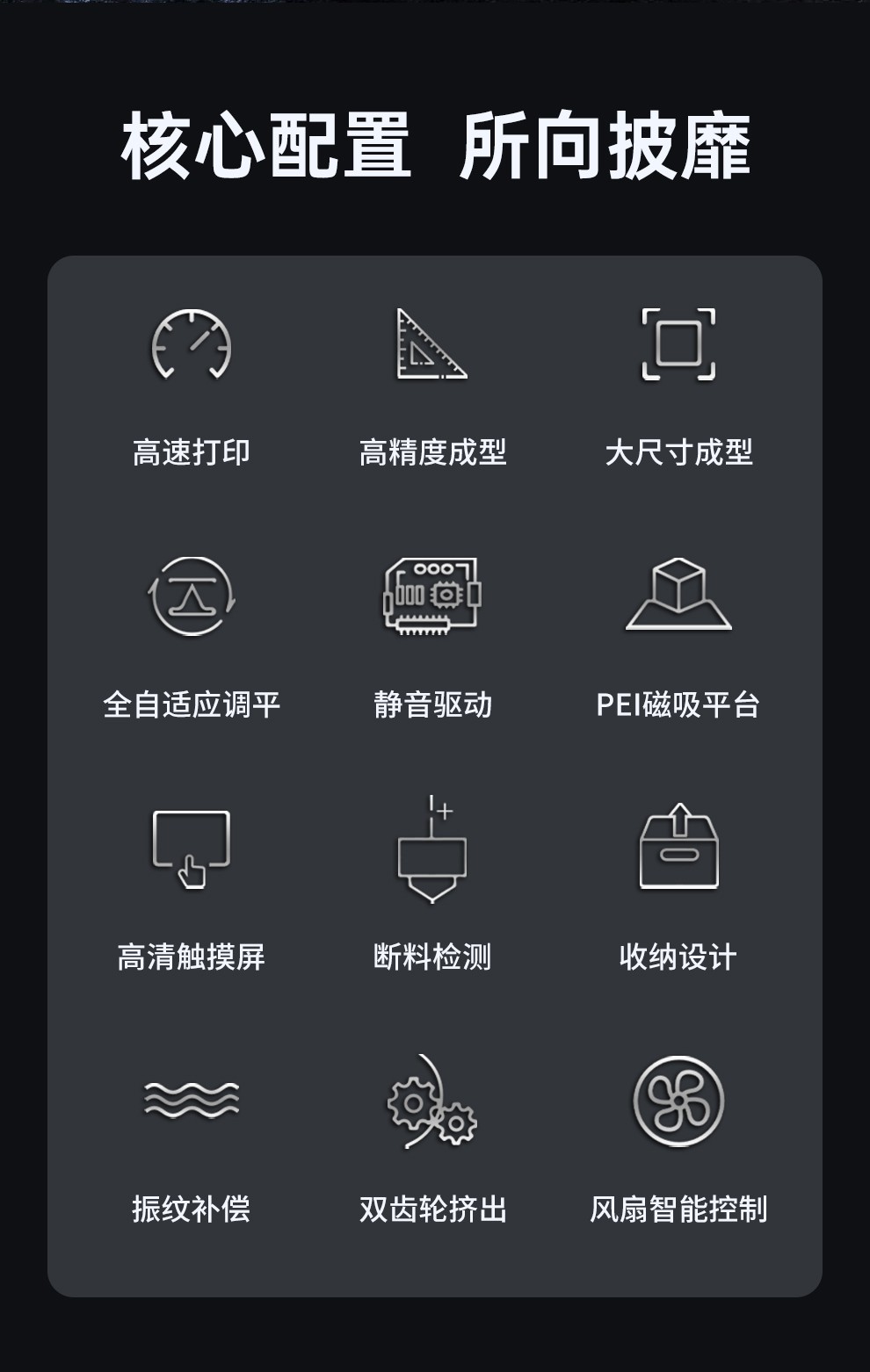 300*300*350mm最大成型空間·9.5倍放大擠出,使出料更均勻,成型更出色,搭載智能風扇控制系統(tǒng),讓高達8500r/min的轉(zhuǎn)速降低噪音,還可以模型散熱更全面的同時高速打印