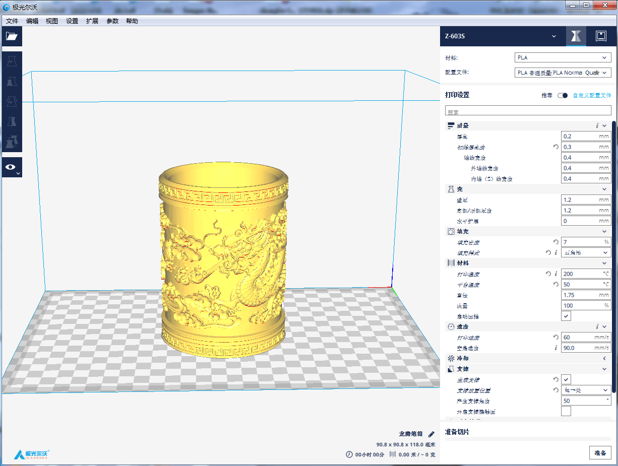 開始打印前,需要再次檢查一遍模型信息,保證模型的各項參數(shù)是正確的。點擊主菜單選擇模型信息即可。其次就是要保證,模型不逾越機(jī)型本身的打印范圍。比如機(jī)器的打印尺寸是280mm*180mm*180mm,那么我們要保證模型在這個尺寸范圍內(nèi)。(一般切片軟件里都設(shè)置好了,不搞錯機(jī)型就好,超出了就是灰色,顯示的是無法切片或者提示文件過大無法切片)
