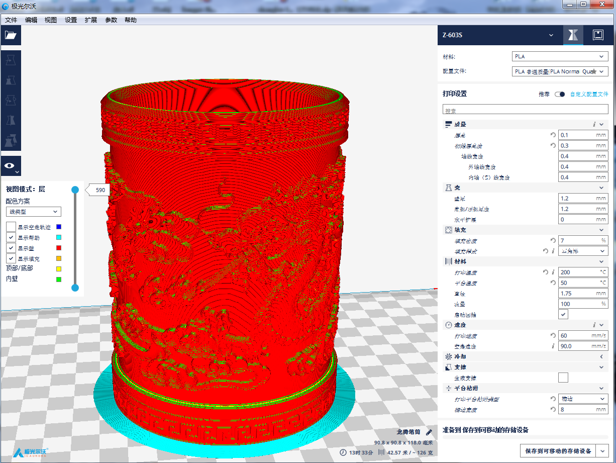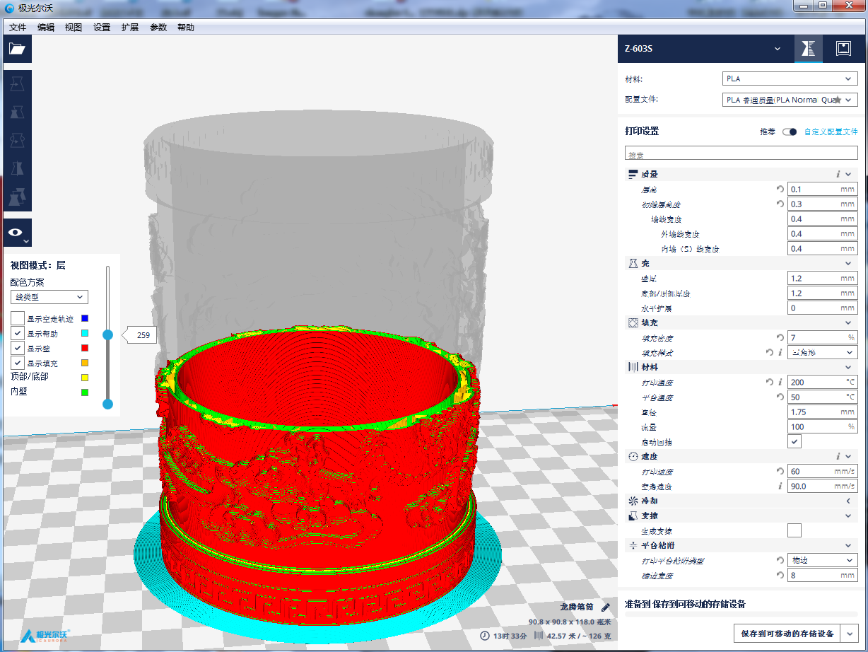在主菜單中一般會有“打印層”這個選項,這個功能主要是幫助我們來分解打印機(jī)打印的過程,用戶可以在軟件中事先預(yù)覽觀察整個打印過程。點擊后,你可以看到模型發(fā)生了一些變化。